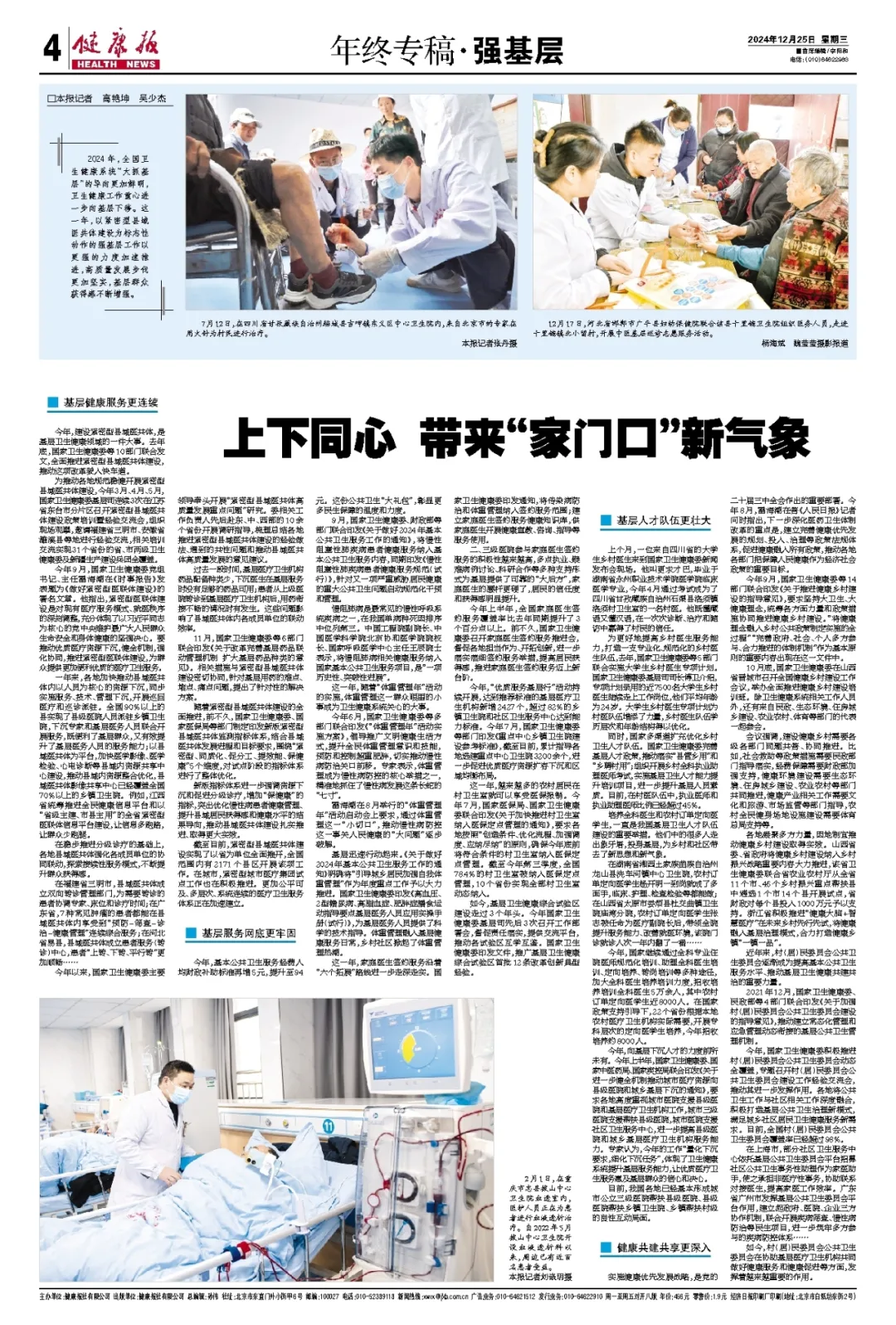 2024年,全国卫生健康系统“大抓基层”的导向更加鲜明,卫生健康工作重心进一步向基层下移。这一年,以紧密型县域医共体建设为标志性动作的强基层工作以更强的力度加速推进,高质量发展步伐更加坚实,基层群众获得感不断增强。