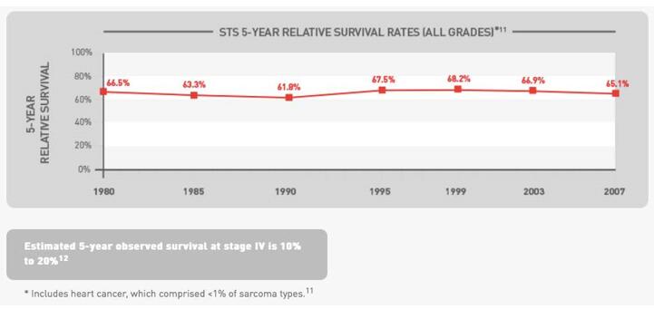 据美国国家癌症研究所(The National Cancer Institute)估计,2016年将约有1.2万例STS新增病例以及近5千例死亡人数。经手术治疗后,针对STS的最常见的方案是接受多柔比星单药治疗或与其他药物联合治疗。STS能在人体内众多组织部位产生病灶,包括肌肉、脂肪、血管、神经、肌腱或关节内衬。