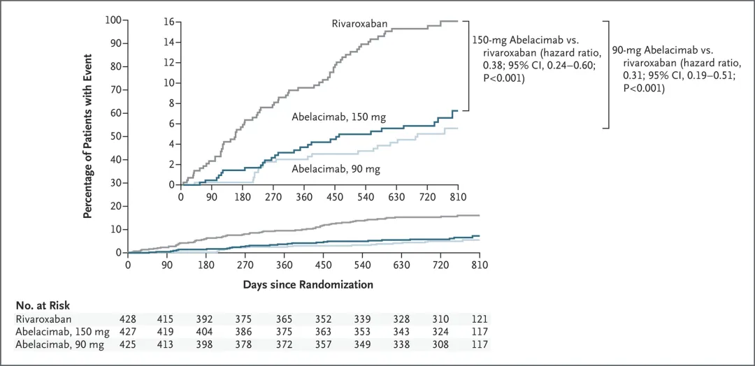 此外,150 mg abelacimab组患者的重大或临床相关非重大出血事件发生率为每100人年3.2例,90 mg abelacimab组为2.6例,而活性对照组为8.4例。即150 mg abelacimab相比活性对照药物,将患者发生重大或临床相关非重大出血减少62%(P<0.001,HR=0.38,95% CI:0.24-0.60);90 mg abelacimab相比活性对照药物,将患者发生重大或临床相关非重大出血减少69%(P<0.001,HR=0.31,95% CI:0.19-0.51)。