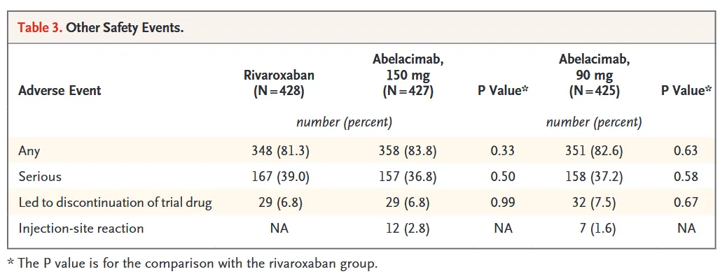 三组的不良事件发生率和严重程度相似,无显著差异。2.8%接受150 mg abelacimab的患者和1.6%接受90 mg剂量的患者发生了注射部位反应。所有患者均未出现抗药抗体。