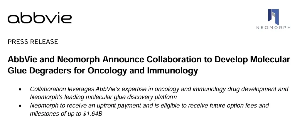 1月23日,艾伯维(AbbVie)和Neomorph宣布达成一项合作和选择许可协议,为肿瘤学和免疫学的多个靶点开发新型分子胶降解剂。Neomorph将从AbbVie获得预付款,并有资格获得高达16.4亿美元的期权费和里程碑,以及净销售额的分层特许权使用费。