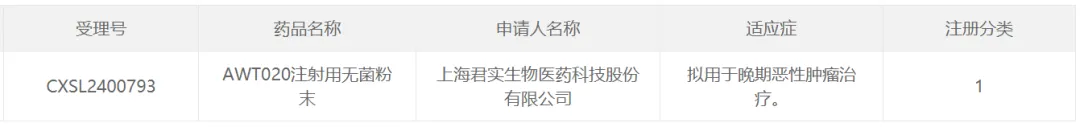 今日(2月5日),中国国家药监局药品审评中心(CDE)官网最新公示,由君实生物申报的1类新药AWT020注射用无菌粉末获批临床,拟开发治疗晚期恶性肿瘤。公开资料显示,这是一款抗PD-1/IL-2c融合蛋白。2024年11月,君实生物宣布以超7.5亿元引进两款癌症双靶点融合蛋白药物在大中华区的权益,其中一款产品已向CDE提交临床试验申请。根据CDE官网查询,这可能正是本次获批IND的AWT020注射用无菌粉末。