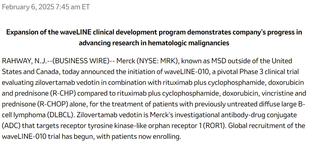 2025年2月6日,默沙东宣布启动ROR1 ADC新药Zilovertamab Vedotin联合R-CHP对照R-CHOP一线治疗弥漫性大B细胞淋巴瘤(DLBCL)的关键三期临床试验。