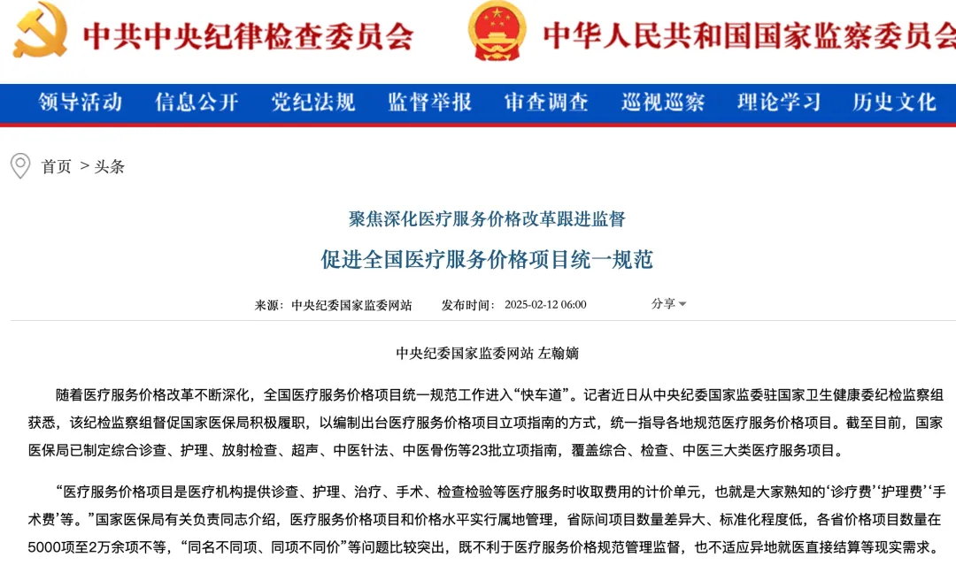 2月12日,中纪委官网发布题为《聚焦深化医疗服务价格改革跟进监督 促进全国医疗服务价格项目统一规范》的头条文章(完整附文末)。