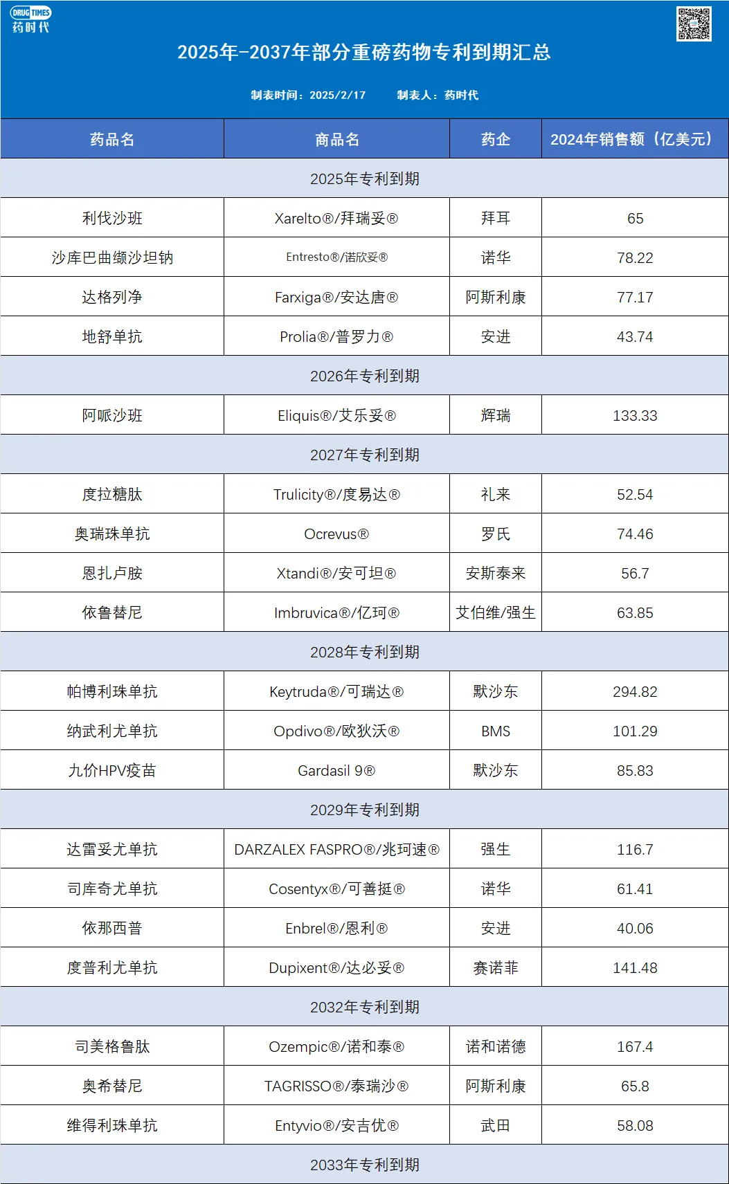 为此,药时代罗列了部分重磅药物的专利信息。截止2037年,超25款产品将会面临专利悬崖,以2024年销售额为准,合计潜在损失金额超2364亿美元。