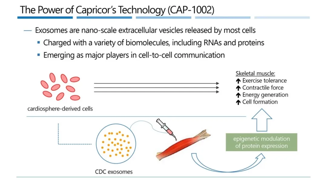 Deramiocel(又名CAP-1002)是一种同种异体外泌体细胞疗法,它们由心脏来源细胞(CDCs)组成,CDCs通过分泌被称为外泌体的细胞外囊泡来发挥作用,这些外泌体靶向巨噬细胞并改变其表达谱,使其采用愈合表型,而非促炎表型。deramiocel在临床前和临床研究中已显示出在肌营养不良和心力衰竭中具有强大的免疫调节、抗纤维化和再生作用。
