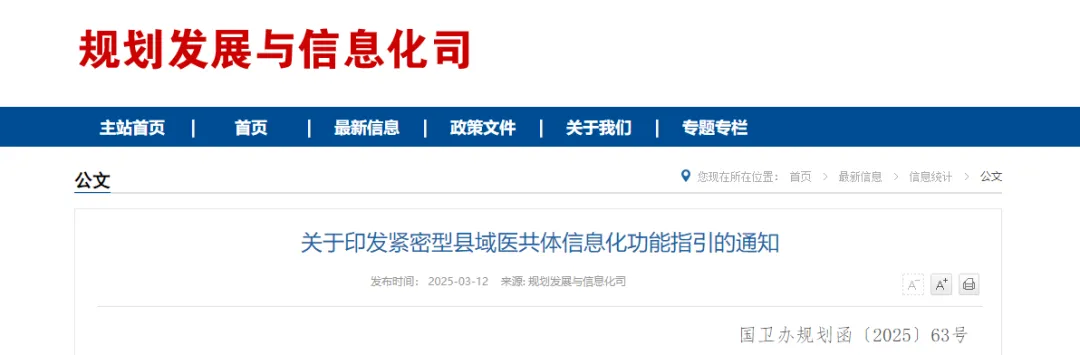 为贯彻落实国务院办公厅《关于推进医疗联合体建设和发展的指导意见》(国办发〔2017〕32号)及国家卫生健康委等10部门印发的《关于全面推进紧密型县域医疗卫生共同体建设的指导意见》(国卫基层发〔2023〕41号)等文件精神,规范紧密型县域医共体信息化建设,充分发挥信息化手段提升紧密型县域医共体医疗服务效率和质量作用,国家卫生健康委办公厅、国家中医药局综合司、国家疾控局综合司联合印发了《关于印发紧密型县域医共体信息化功能指引的通知》(以下简称《通知》)。