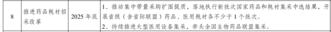 安徽省发布2025年重点工作任务清单,明确提出“推进药品耗材招采改革”,包括开展省级(含省际联盟)药品、医用耗材各不少于1个批次;牵头全国生物药品联盟集采。