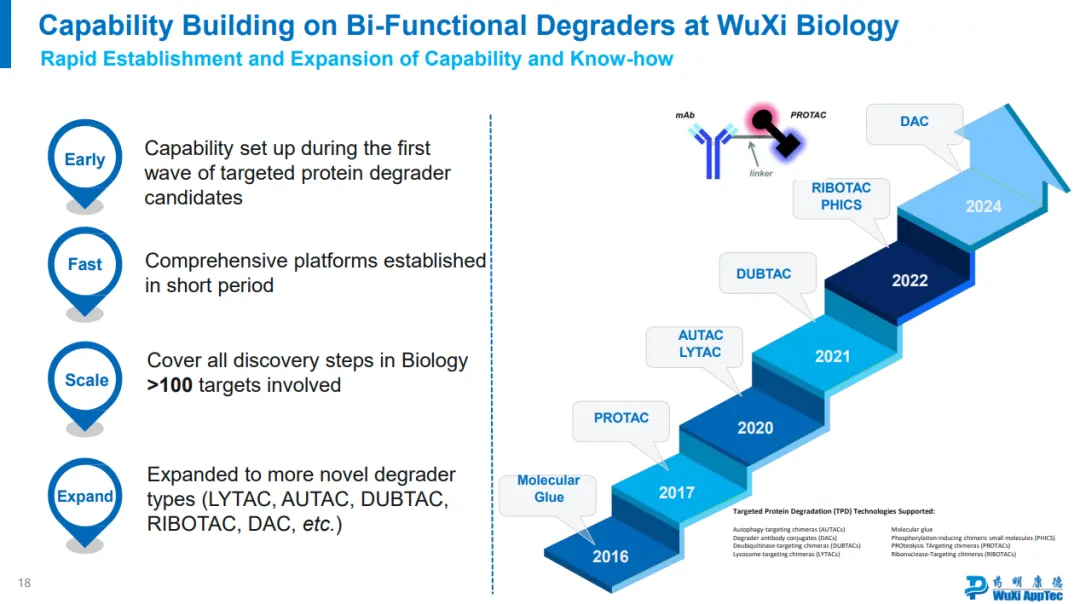 作为业内靶向蛋白降解药物开发的重要赋能平台之一,药明康德早在此类药物的浪潮刚刚兴起之际,就快速搭建了综合性的赋能平台,能力涵盖PROTAC、分子胶、AUTAC、LYTAC、DUBTAC、RIBOTAC、PHICS、以及DAC等主要分子类型。根据去年投资者开放日公布的信息,自2021年起,该平台已为靶向蛋白降解领域中66%的活跃公司提供了赋能合作。