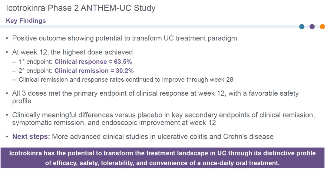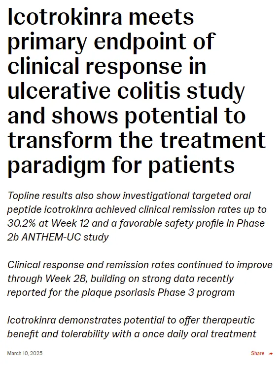 2025年3月10日,强生公布IL-23R口服环肽抑制剂治疗溃疡性结肠炎2b期临床数据,研究达到临床缓解主要终点,有望改变溃疡性结肠炎的治疗格局。