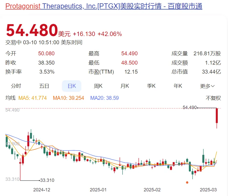 消息公布后,Protagonist Therapeutics股价大涨42%,市值达到33亿美元。