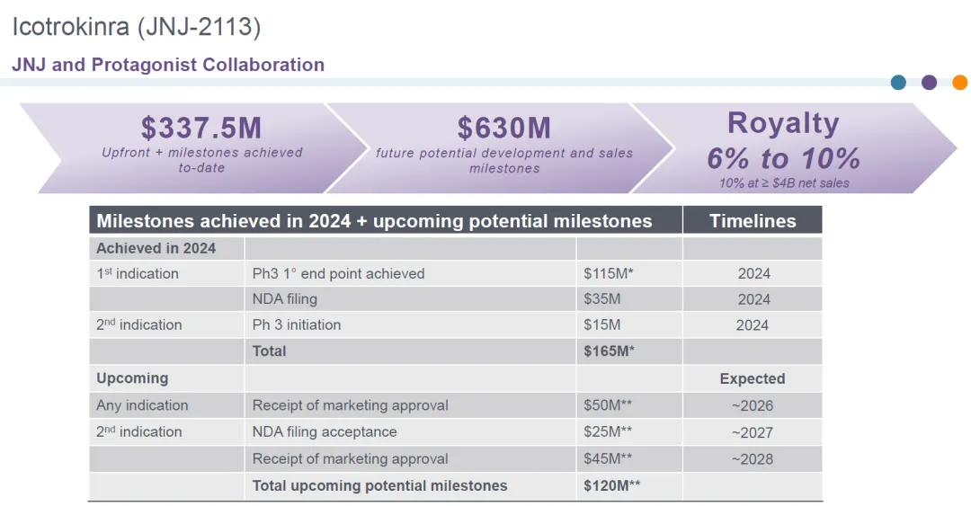 Protagonist与强生就JNJ-2113达成的合作金额高达10亿美元,Protagonist已经收到3.375亿美元预付款和里程碑,还有6.3亿美元潜在里程碑金额,以及6-10%的销售分成。