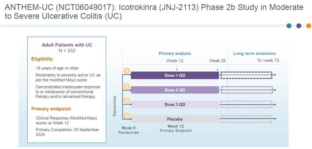 此次公布的溃疡性结肠炎2b期临床设计如下,包括3个剂量组和安慰剂组,治疗12周观察主要终点临床响应率。