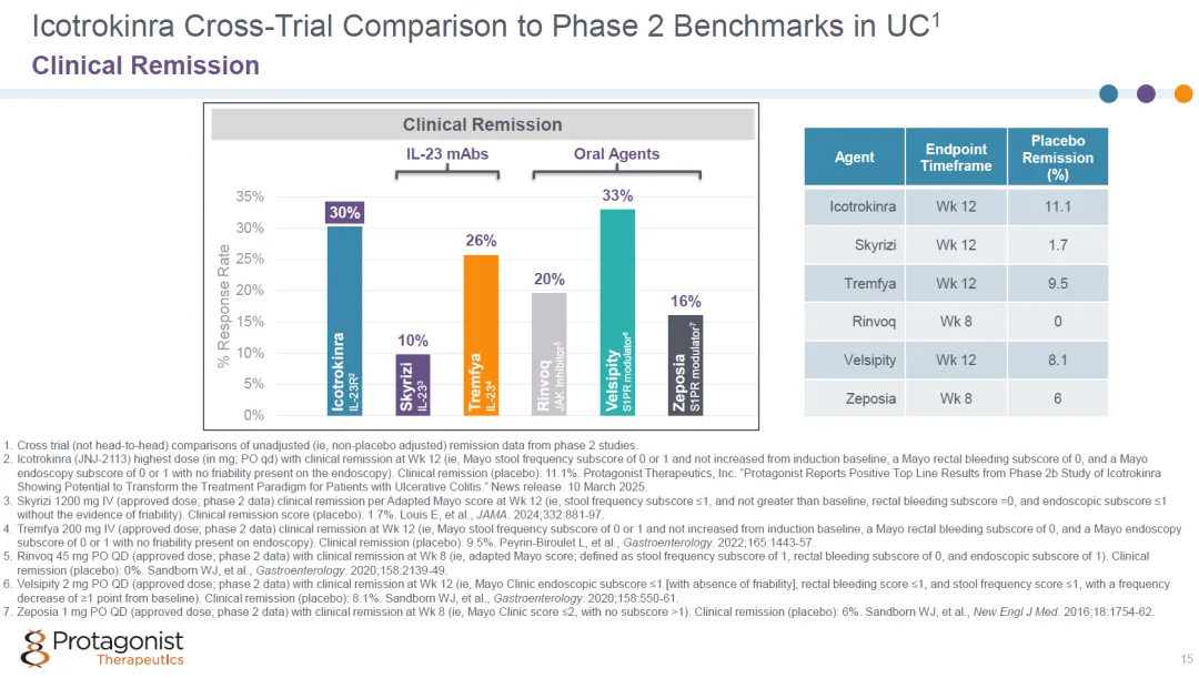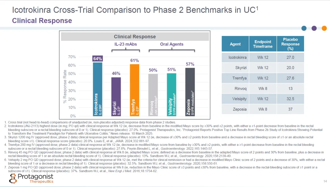 与其他治疗药物相比,JNJ-2113治疗12周临床响应率更高,相比于IL-23抗体优势则更为显著。