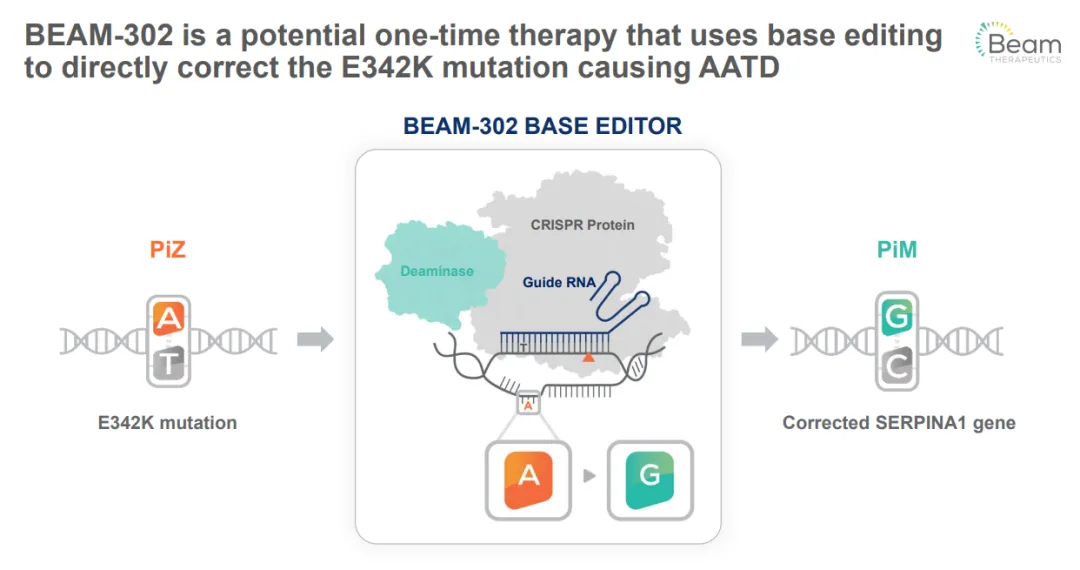 AATD是一种由SERPINA1基因突变导致的罕见遗传病,受影响的人体内无法生成正常水平的α1-抗胰蛋白酶(AAT),这是一种由肝脏合成的蛋白质,主要作用是保护肺部免受炎症损伤。由于蛋白质异常,AATD患者导致早发性肺气肿和肝病,BEAM-302是一种针对肝脏的脂质纳米颗粒(LNP)配方,内含指导RNA(gRNA)和编码碱基编辑器的mRNA,旨在修正致病的PiZ突变。携带该突变纯合子的患者,其血液循环中功能性AAT蛋白水平极低,且全部为突变型(称为Z-AAT),该突变蛋白会积聚并引起肝脏毒性。