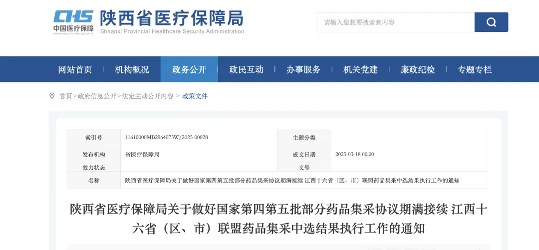 3月18日,陕西省医保局发布通知,将于4月1日起执行江西十六省(区、市)联盟药品集采中选结果。省公共资源交易中心要于3月28日前组织各方及时完成中选结果落地执行准备工作,并对本次集采项目中涉及的非中选产品按要求进行价格治理,防范高价挂网风险。