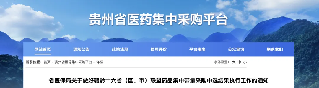 贵州省医保集中采购平台近日也发布通知,赣黔十六省(区、市)联盟药品集中带量采购中选结果将在3月31日落地,采购周期两年。