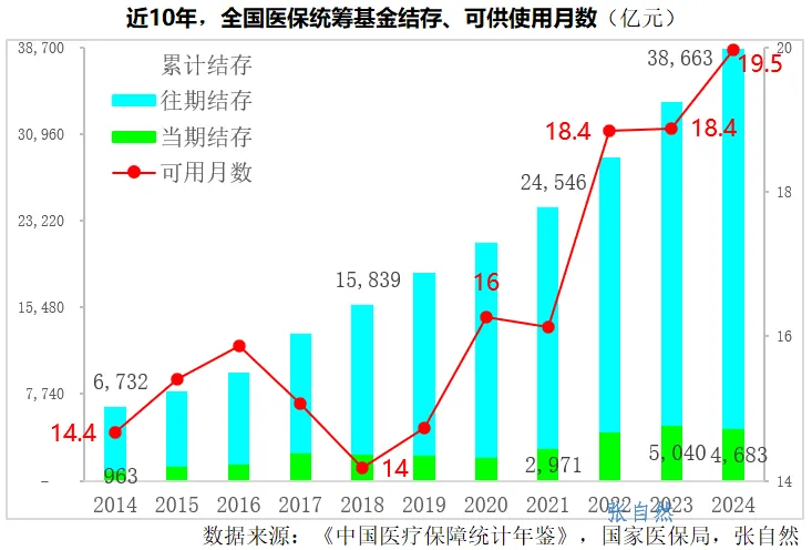 2024年,全国医保统筹基金收入28507.29亿元(其中,职工医保统筹基金收入17368.93亿元,居民医保基金收入11138.36亿元)、统筹基金支出23824.42亿元(其中,职工医保统筹基金支出13205.04亿元,居民医保基金支出10619.38亿元),当期结存4682.87亿元,累计结存38662.62亿元,可供使用19.5个月,较上年增加了1.03个月,统筹基金的缓冲能力增强。