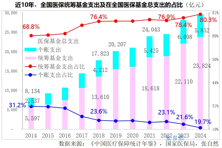 《快报》显示,全国医保基金总支出29675.92亿元,其中,统筹基金支出23824.42亿元、个人账户支出5851.1亿元,分别占了全国医保基金总支出的80.3%、19.7%。统筹基金的占比较上年增加了2个百分点,说明医保基金的共济效能进一步增强。部分是因个账记账方式改革(将单位帮职工缴纳的原计入职工个人账户的部分资金改为计入职工统筹账户)2023年全面落地所致。(详见下图)