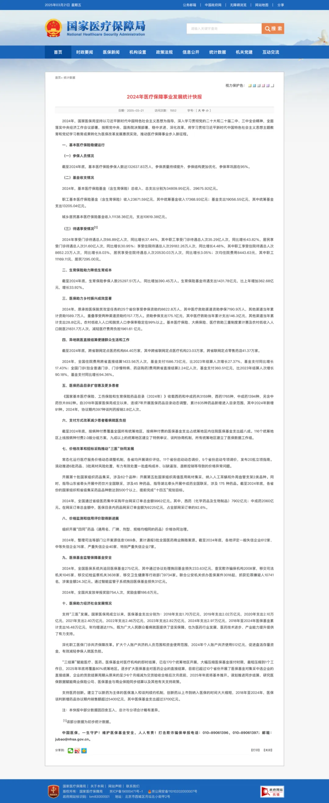 3月21日,国家医保局发布《2024年医疗保障事业发展统计快报》(以下简称《快报》)。
