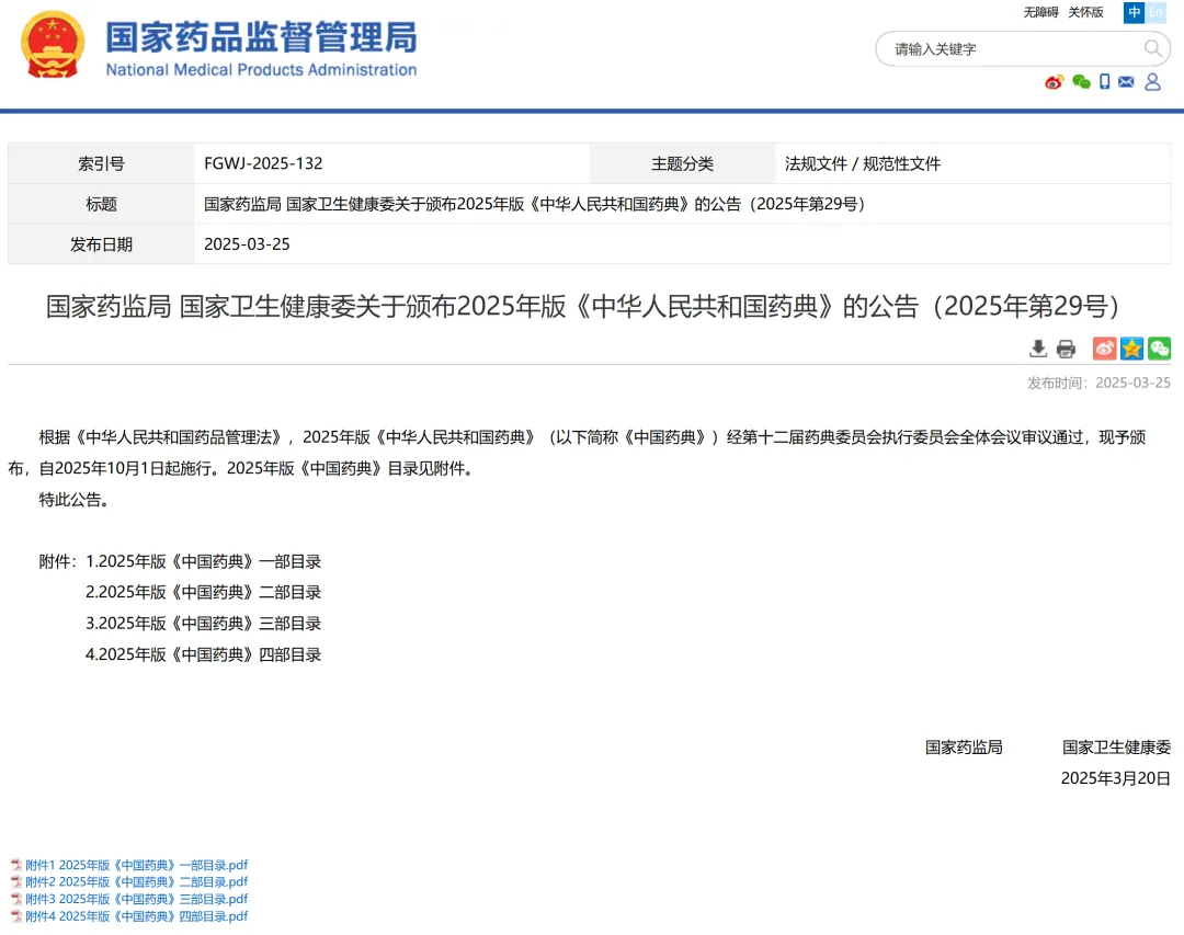 3月25日,国家药监局、国家卫生健康委发布了《关于颁布2025年版《中华人民共和国药典》的公告(2025年第29号)》,并声明自2025年10月1日起施行!