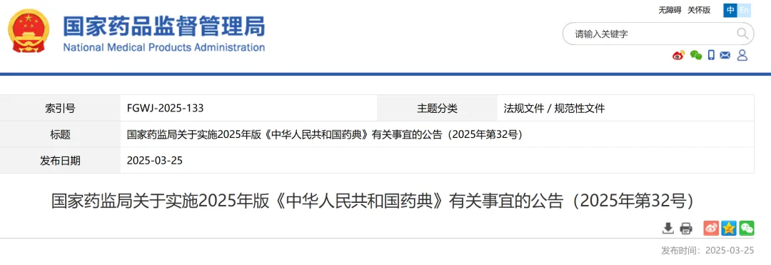 同时,国家药监局发布了《关于实施2025年版《中华人民共和国药典》有关事宜的公告(2025年第32号)》。