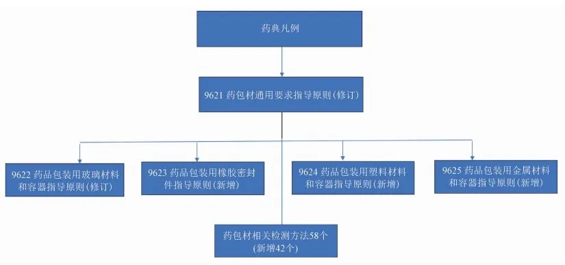 在药包材方面,修订了《9621药包材通用要求指导原则》,在药典原收载《9622药用玻璃材料和容器指导原则》基础上,根据药包材材质的分类新增了橡胶类、塑料类、金属材料类包材指导原则(见图2),基本涵盖了药物制剂常用药包材的基本要求[8]。