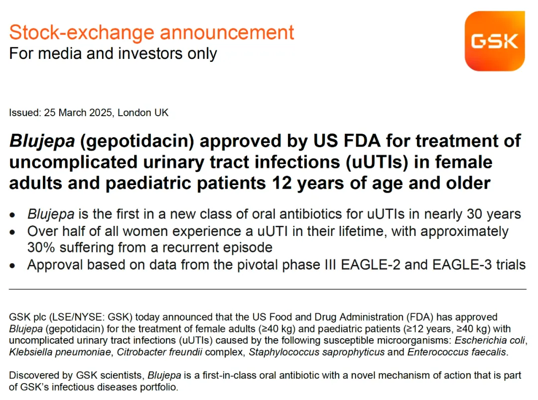 Blujepa的获批不仅标志着GSK在感染性疾病领域的持续领跑,更预示着抗生素研发从"分子改良"向"机制革命"的战略转型。在中国抗菌药物临床使用强度仍高于欧美的现状下,此类创新药物的引进将加速耐药菌防治体系的升级。当"后抗生素时代"的警钟持续敲响,双靶点抗生素的诞生或许正是人类重夺抗感染战争主动权的重要转折。