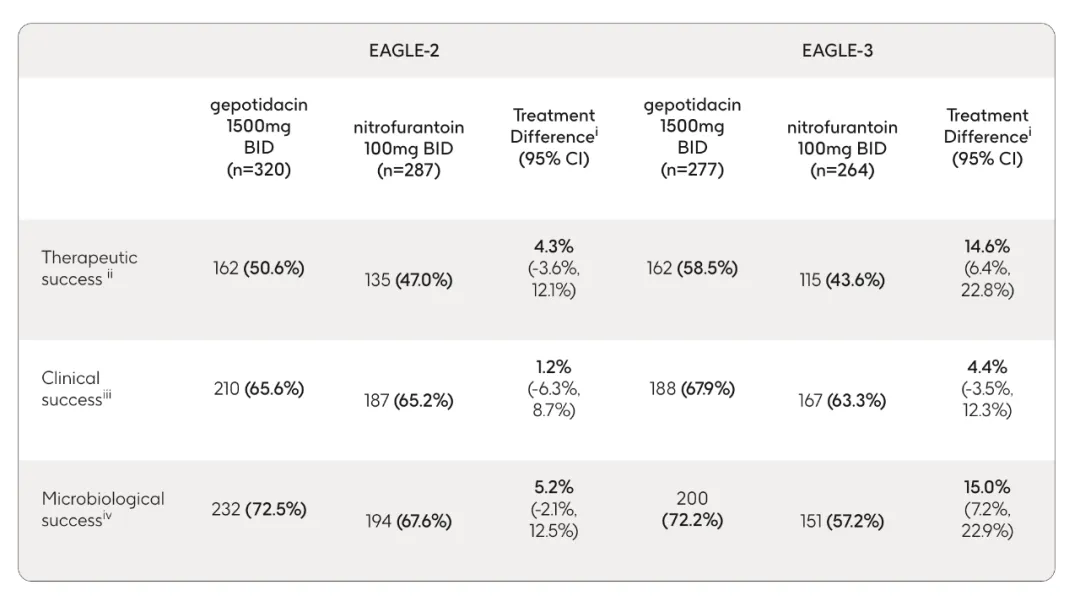 非劣效性奠基:针对硝基呋喃妥因(当前uUTI一线用药)达成非劣效(EAGLE-2:50.6% vs 47.0%)