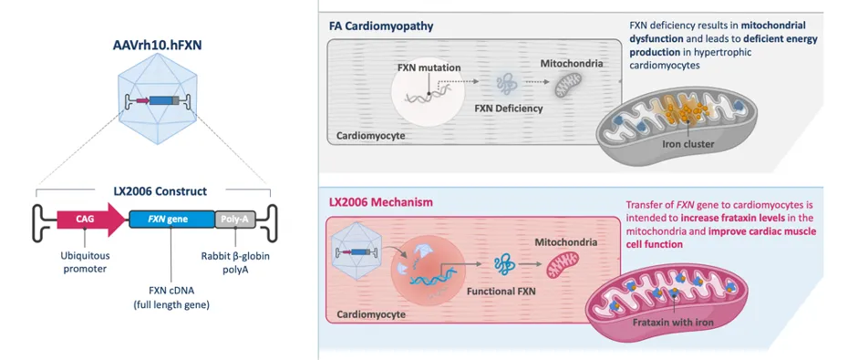 FA心肌病是FA患者死亡的主要原因。LX2006旨在通过递送功能性frataxin基因拷贝,促进frataxin蛋白在心脏的表达,以恢复心肌细胞的线粒体功能(见图一)。LX2006已被FDA授予罕见儿科疾病、快速通道、孤儿药和再生医学高级治疗认证,用于治疗FA心肌病,并被欧盟委员会授予孤儿药认证。