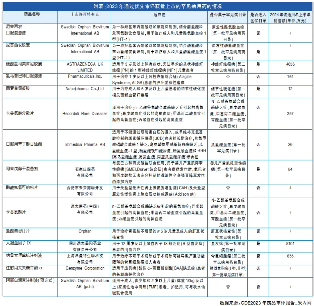 2023年,通过优先审评审批上市的罕见病用药不全是来自于罕见病目录,15个产品仅5个进入医保目录,共有9个可在米内网监测销售数据,其中仅2个产品年销售额有望接近1亿元,分别是硫酸氢司美替尼胶囊和人凝血因子Ⅸ。其他药品销售仍面临挑战,较难达到百万元级别的年销售额。