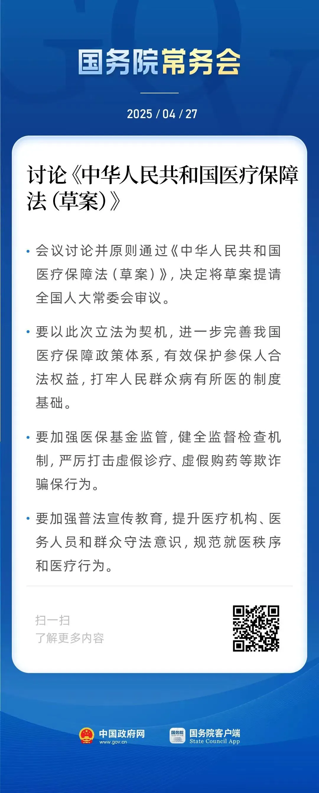 4月27日,国务院常务会议召开,会议讨论并原则通过《中华人民共和国医疗保障法(草案)》,决定将草案提请全国人大常委会审议。