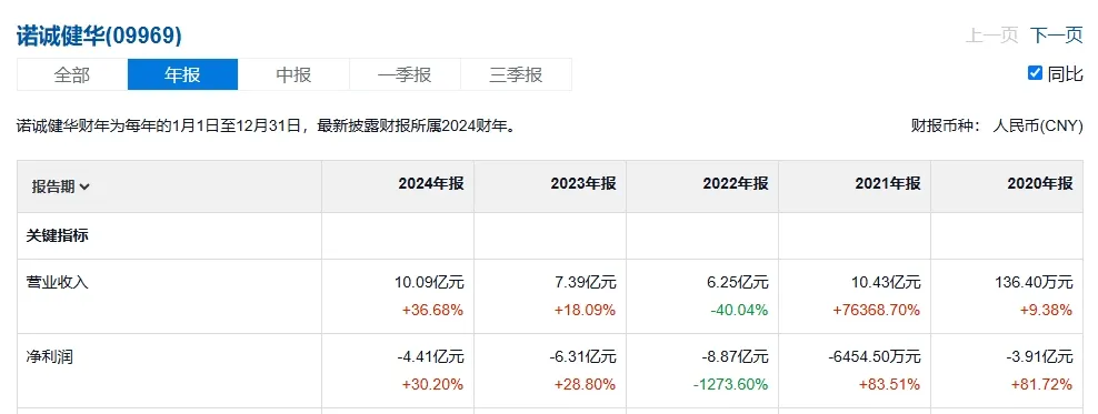 (诺诚健华近四年营收及利润情况,来源:雪球)