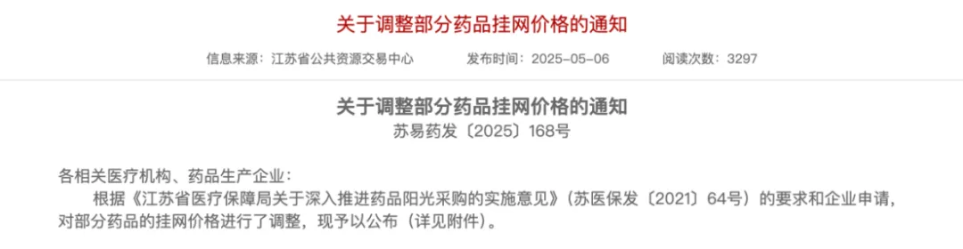 无独有偶,5月6日,江苏省公共资源交易中心发布《关于调整部分药品挂网价格的通知》,共涉及938个药品。其中,安斯泰来的FLT3抑制剂富马酸吉瑞替尼片从68545元降至34273元,价格降幅近50%;此外,礼来的RET抑制剂塞普替尼胶囊也从32833.5元降至18600元,价格降幅为43%。