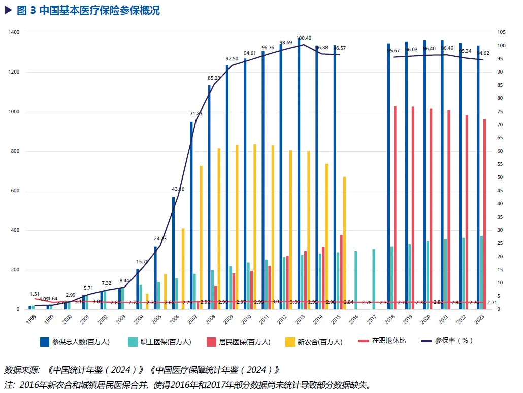 ► 截至2023年底,中国基本医疗保险覆盖13.34亿人,占全国总人口的94.6%。