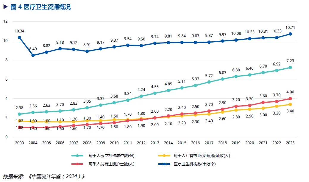 ► 2023年医疗卫生机构数107.08万个,包括3.84万个医院,101.62万个基层医疗卫生机构以及 1.21万个专业公共卫生机构;每千人口医疗卫生机构床位数、每千人口拥有执业(助理)医师数,每千人口注册护士数分别为7.23张、3.40人和4.00人。