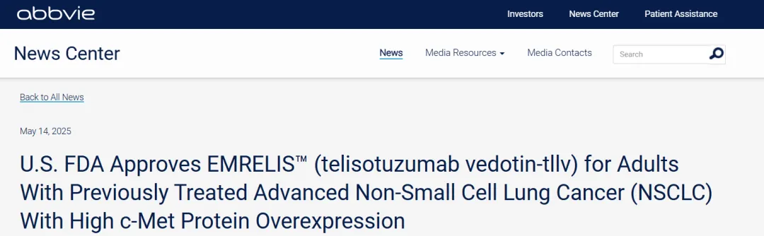 5 月 14 日,艾伯维宣布靶向 c-Met 的抗体偶联药物(ADC)Telisotuzumab Vedotin(Teliso-V)已获得美国 FDA 批准上市,用于先前治疗过的局部晚期或转移性表皮生长因子受体(EGFR)野生型、c-Met 蛋白高表达的非鳞状非小细胞肺癌(NSCLC)成年患者。