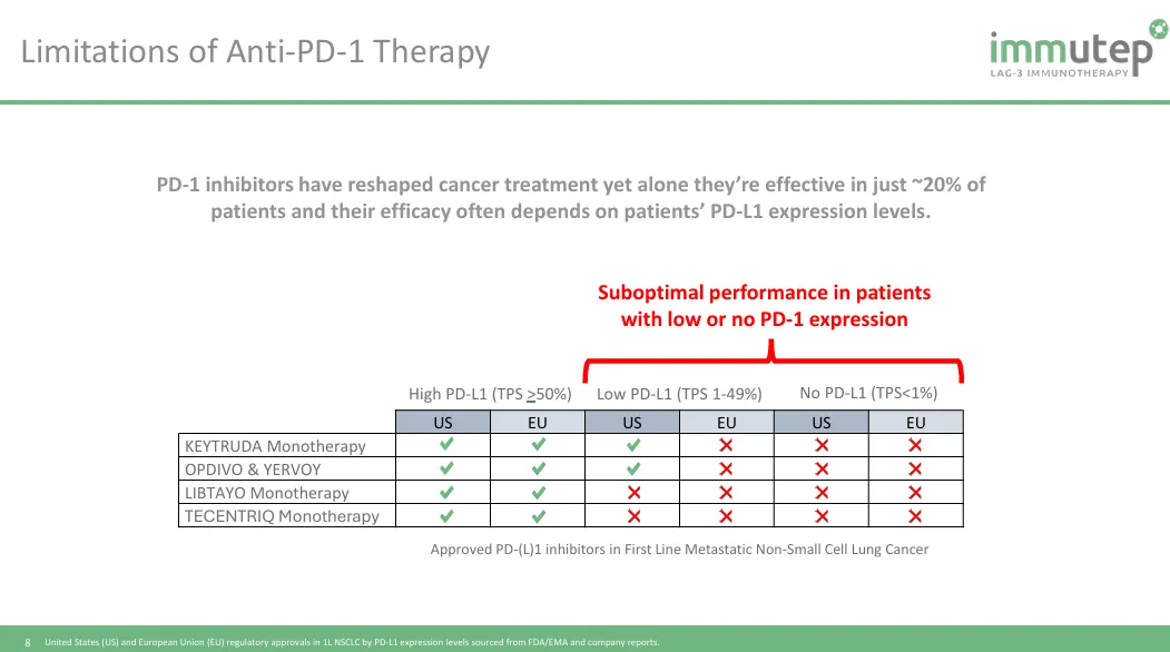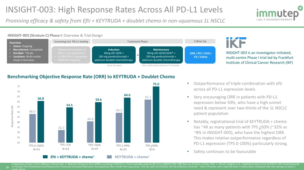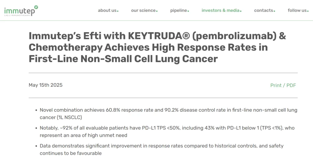 2025年5月15日,专注与LAG3疗法开发的Immutep,更新了一项LAG-3融合蛋白eftilagimod alpha(efti),联合PD-1抗体Pembrolizumab用于一线非鳞状非小细胞肺癌治疗的,一项研究者发起的临床实验INSIGHT-003的初步积极结果,这也是其在继头颈鳞癌(中位OS达到17.6个月,股票大涨45%:Immutep更新LAG-3联合K药头颈鳞癌数据)后的再次突破。