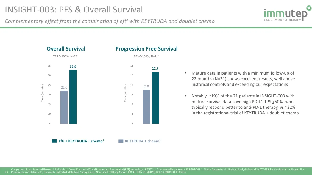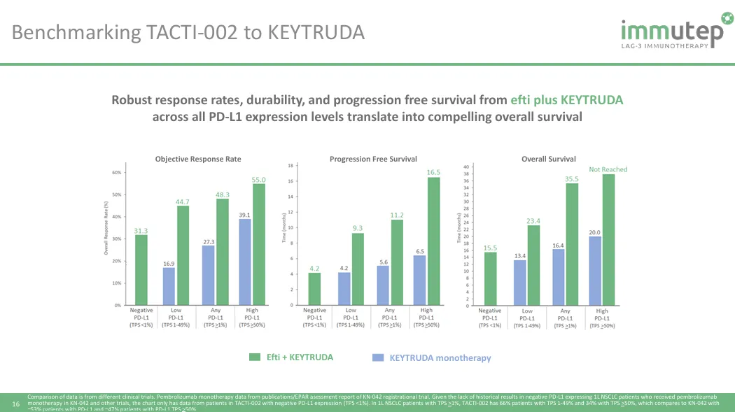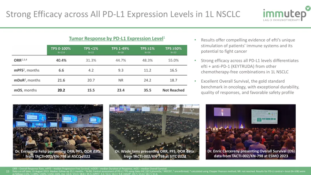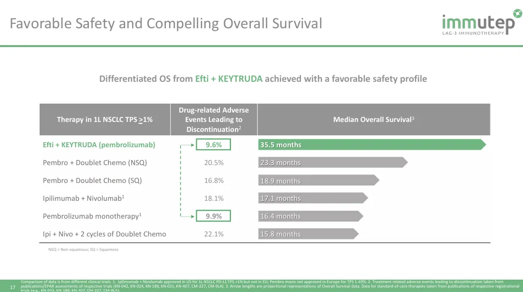 初步的PFS和OS的数据显示,eftilagimod alpha(efti)+Pembrolizumab的联合疗法分别达到了12.7个月和32.9个月,均优于Pembrolizumab+化疗的历史数据。