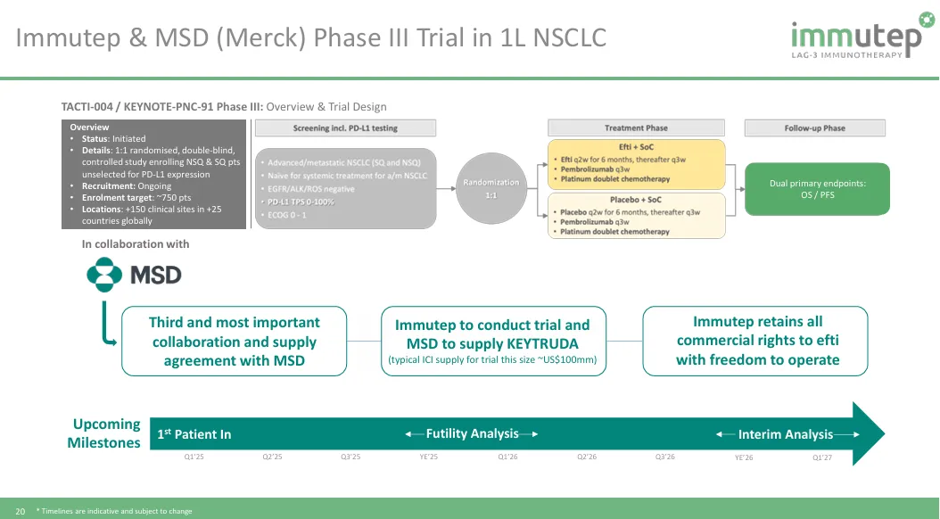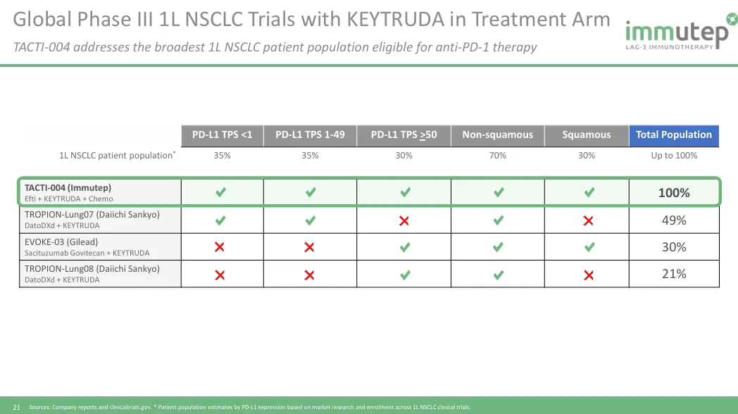 基于以上初步积极临床数据,Immutep和默沙东已经于今年初启动一项注册性三期临床试验TACTI-004/KEYNOTE-PNC-91,和Pembrolizumab+化疗进行头对头比对,并不对PD-L1的表达量进行限制,预计入组750例患者,PFS和OS作为双主要临床试验终点。
