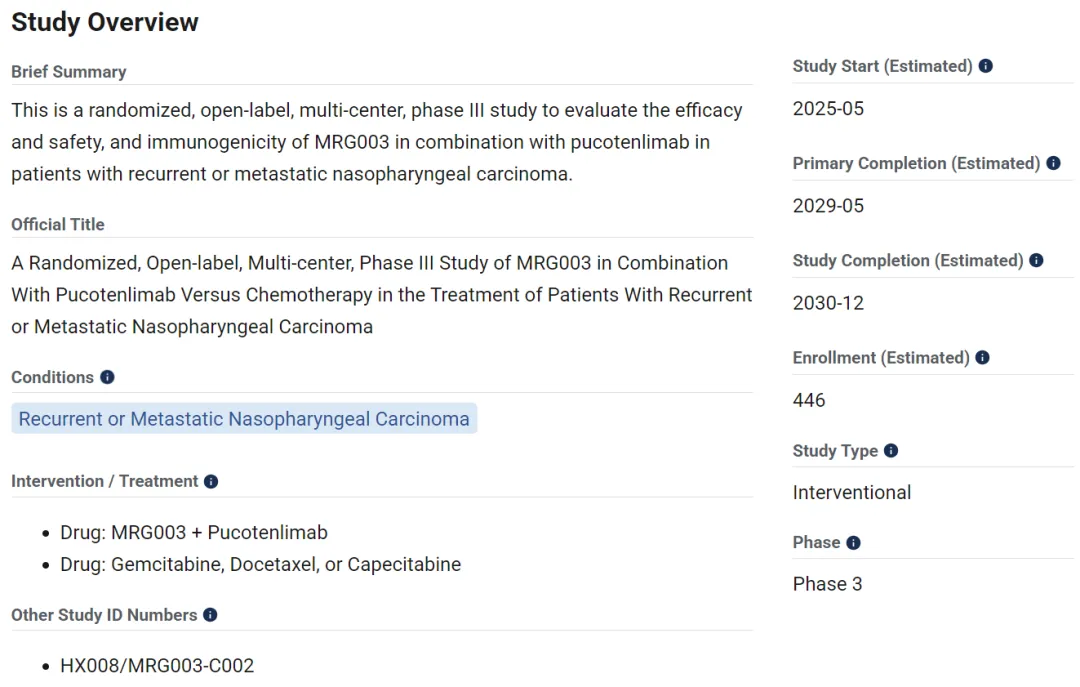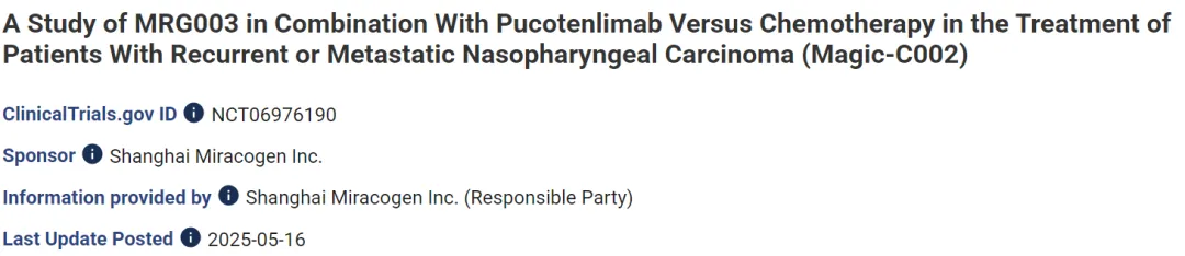 2025年5月16日,乐普生物子公司上海美雅珂在Clinicaltrials.gov网站上注册了EGFR ADC新药MRG003+PD-1抗体普特利单抗联合治疗复发性或转移性鼻咽癌的三期临床试验Magic-C002。