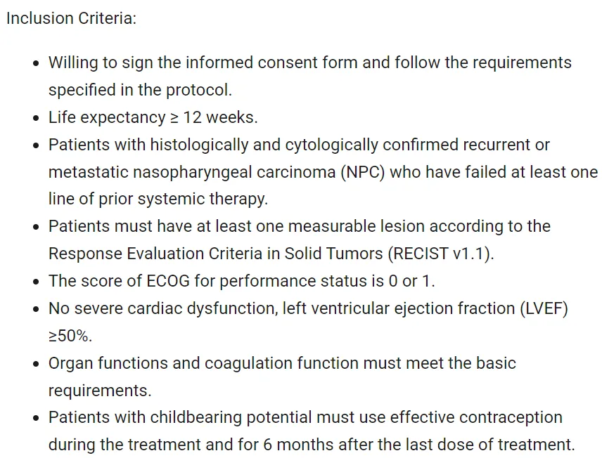 该三期临床入组标准为至少经过一线系统治疗四百的复发性或转移性鼻咽癌患者。