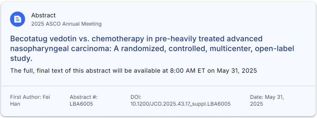 Vedotin(MRG003)治疗晚期鼻咽癌注册性随机对照IIb期临床数据入选late-breaking abstracts(重要突破摘要)。