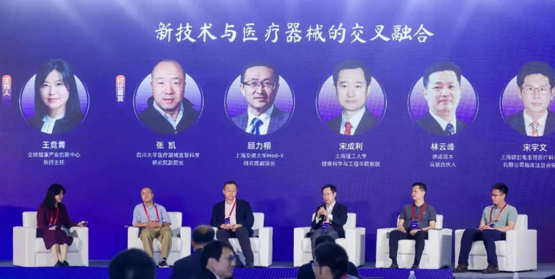 主题讨论环节在全球健康产业创新中心执行主任王竟菁的主持下,由四川大学医疗器械监管科学研究院副院长张凯、上海交通大学Med-X研究院副院长顾力栩、上海理工大学健康科学与工程学院教授宋成利、德诺资本高级合伙人林云峰、上海微创电生理医疗科技股份有限公司临床注册高级总监宋宇文,围绕“新技术与医疗器械的交叉融合”进行讨论。