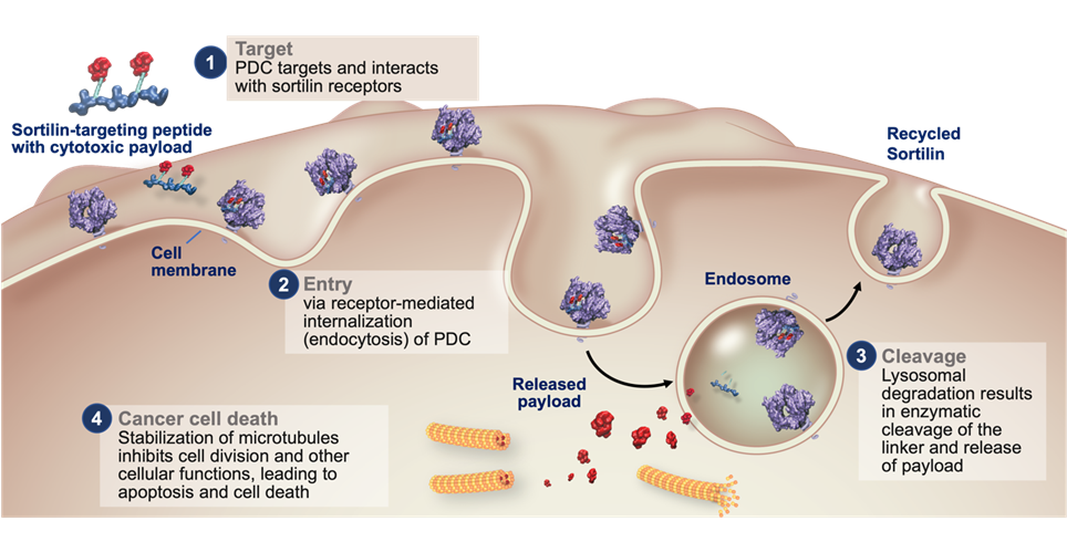 图1. 靶向Sortilin的PDC肿瘤学产品作用机制示意图,来源:Endpoints News