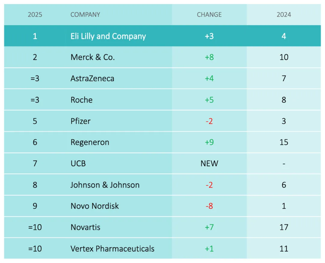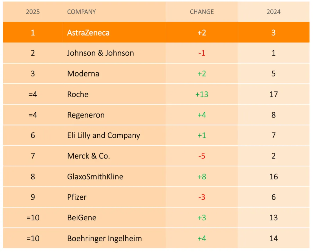 强生今年跌至第二名,莫德纳(Moderna)位居第三,罗氏和再生元排名显著跃升,分别从去年的第17名和第8名上升至并列第4名。
