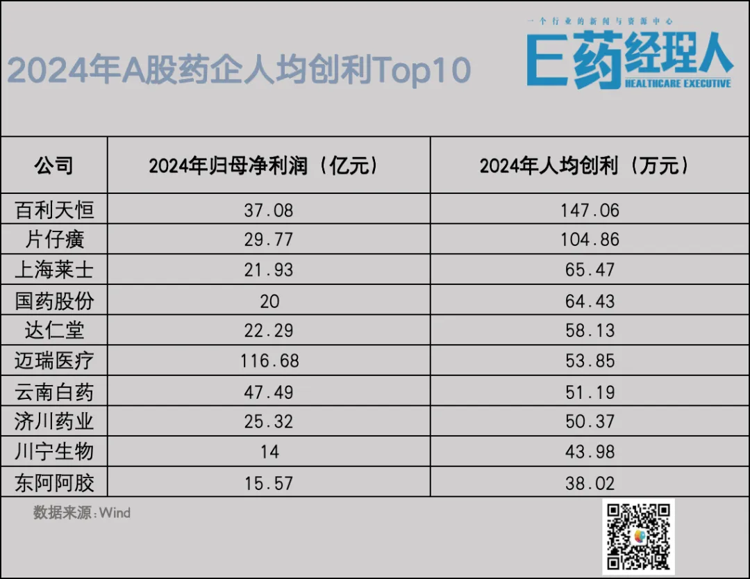 E药经理人根据Wind数据库统计了92家营收在50亿以上的医药上市公司的人效,主要由人均创利(归母净利润/员工总数)为指标,以此来反映过去一年来行业整体的风貌。