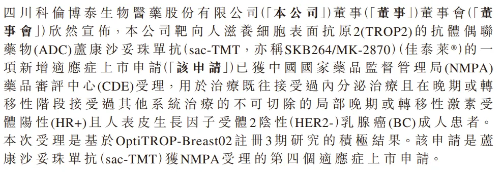 根据科伦博泰发布的公告,此次申报的适应症为既往接受过内分泌治疗且在晚期或转移性阶段接受过其他系统治疗的不可切除的局部晚期或转移性HR+/HER2-乳腺癌成人患者。