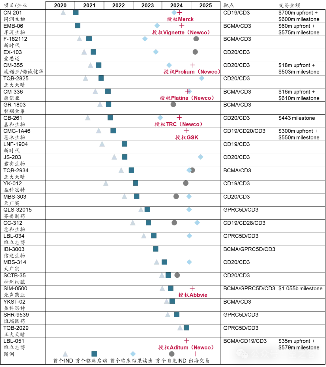 这个赛道的交易态势就更简单粗暴,由于B细胞清除机制的确定性高以及对于自免广大治疗领域的FoMo心态,或MNC直接下手、或采取Newco形式,进度靠前的TCE资产几乎被一网打尽。