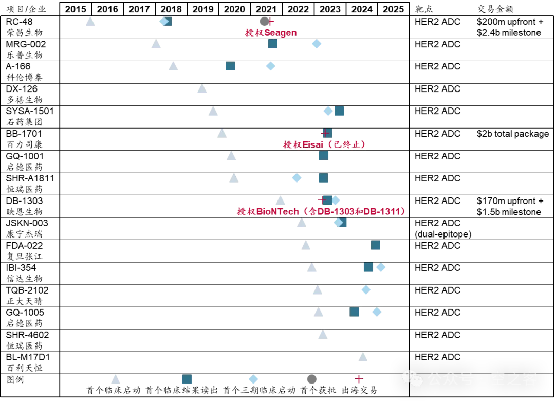 在HER2靶点上,由于是第一三共版本的ADC平台出茅庐第一仗,以及彼时中国Biotech的能力尚未成为全球行业共识,从IND开始后的临床进度多数还比较拖沓,也就只有RC-48、BB-1701和DB-1303等少数管线获得交易机会。
